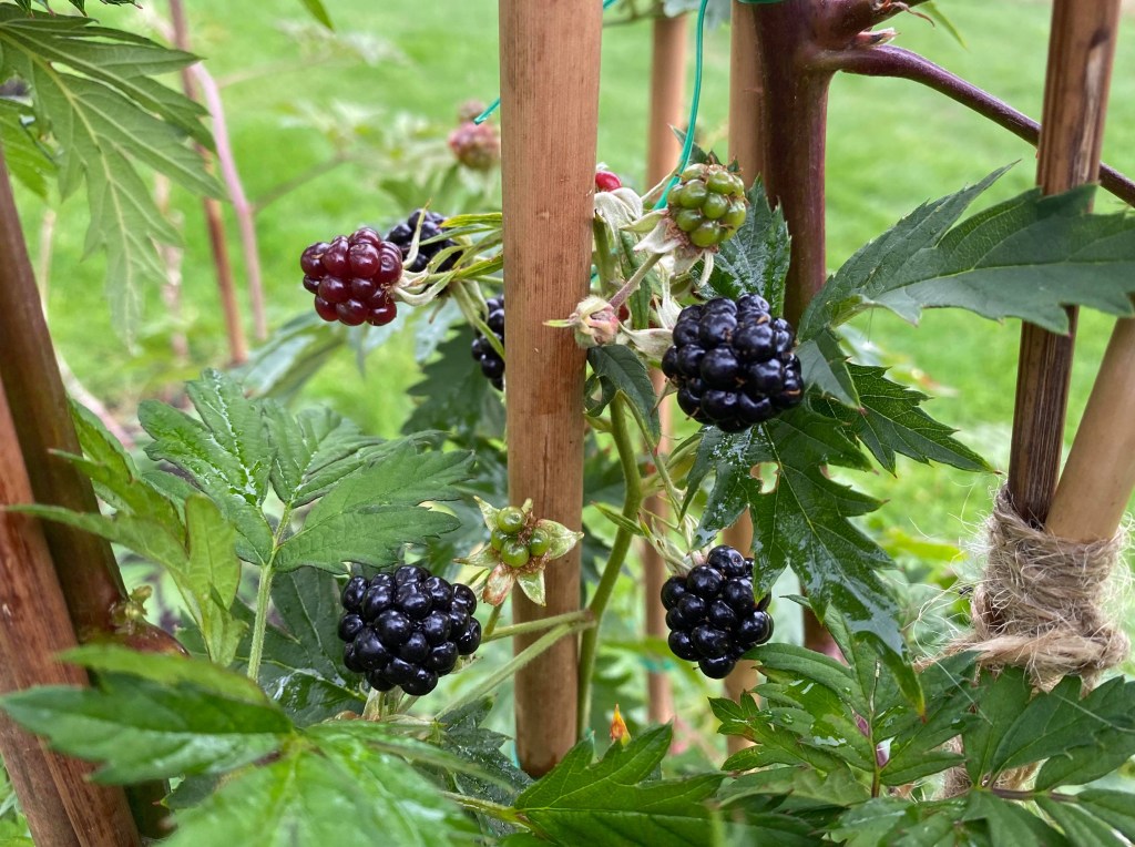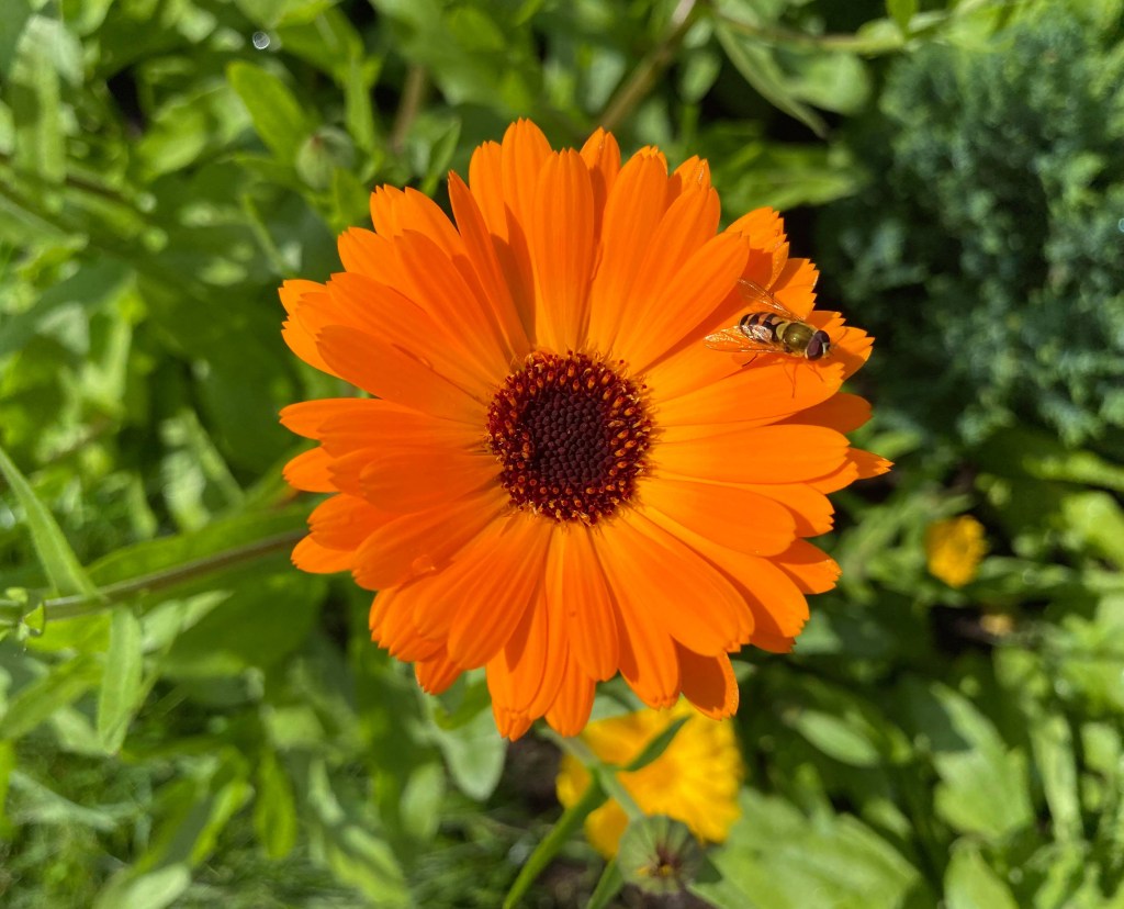 Jag gillar min lilla trädgård. Ringblommorna blommar för fullt. Ikväll upptäckte jag att björnbären börjar mogna. Så roligt! Jag åt upp tre stycken, den första skörden på denna nyplanterade buske. På krassen hittade jag melerade blommor. Jättefina. Jag njuter så av min trädgård och är tacksam för den.