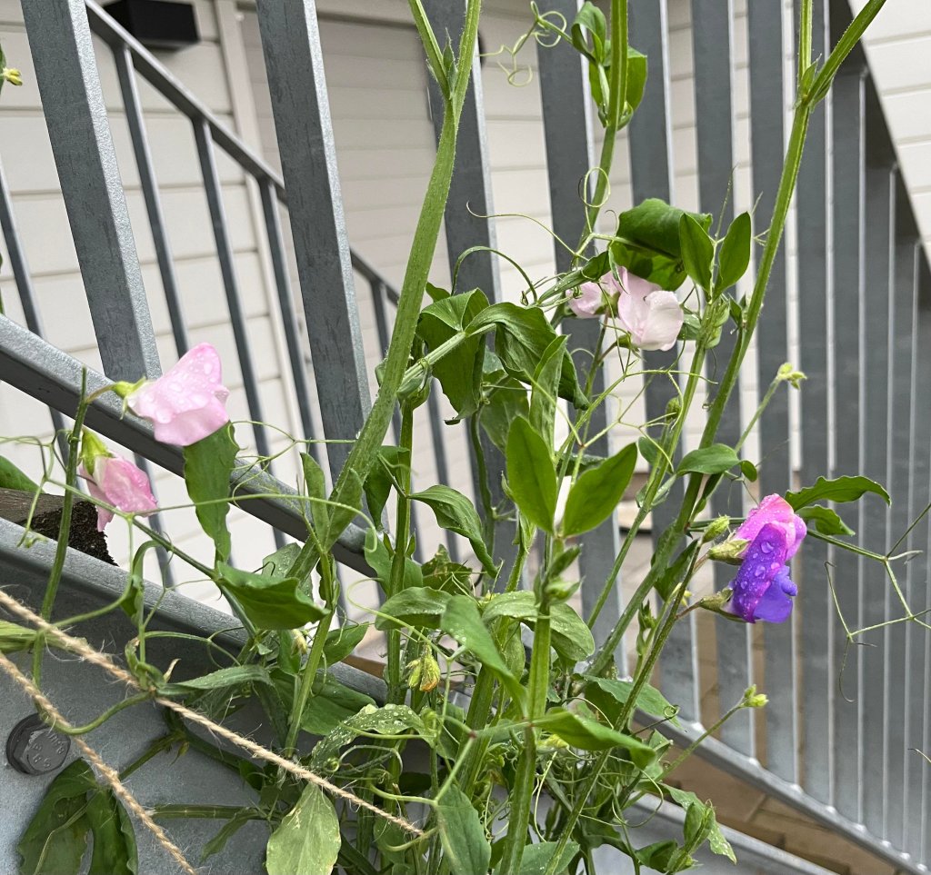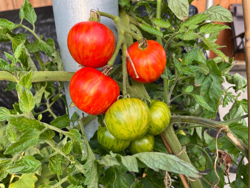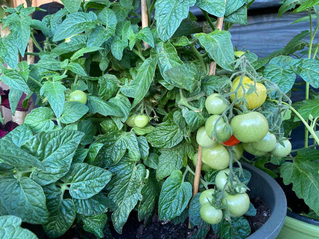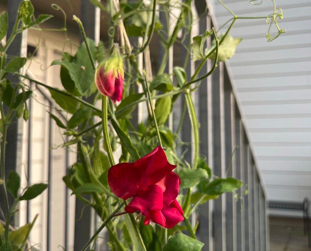 Luktärterna blommar så sakteliga och några tomater är nu mogna. Jag fick en tomatplanta av mina grannar i somras och nu har den vuxit till sig och bär frukt. Trevligt och gott.