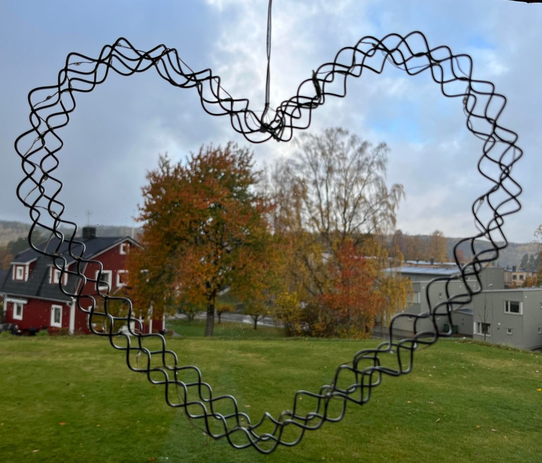 Jag sitter vid mitt skrivbord och tittar ut. Jag ser träd i vackra färger. Jag kan inte låta bli utan måste ta ett foto genom hjärtat som hänger i fönstret. Älska hösten, ja, det är faktiskt det jag gör. Så många färger i naturen!