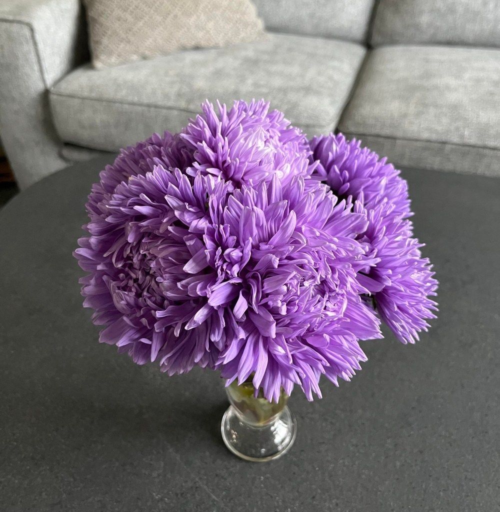 Trädgårdsnejlikan har blommat sen i våras och den tål frost så jag hoppas den är fin ännu ett tag. För första gången i mitt liv har jag sått aster och nu blommar de för fullt. Det är bara lila astrar i mitt blomland. Är de extra motståndskraftiga kanske? Jag hade sått blandade färger men det är bara lila blommor som finns där. De är jättefina i buketter inne.