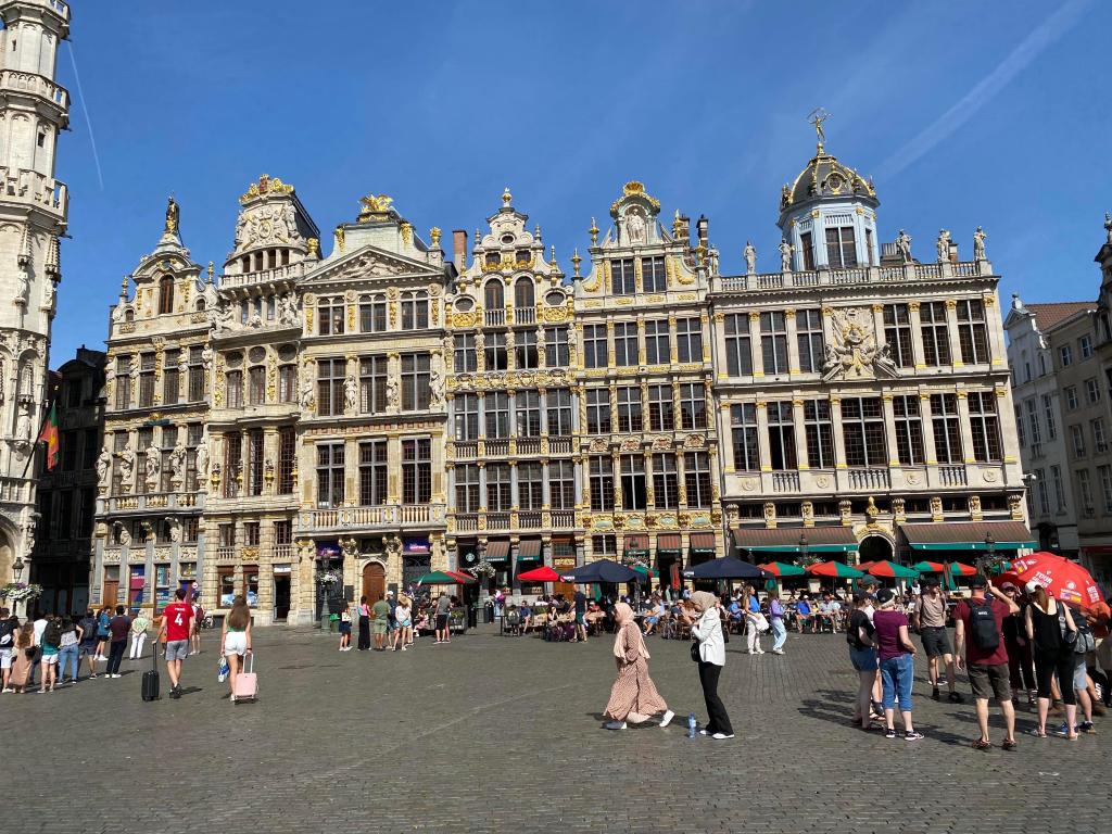 I tidig morgonstund styrde vi kosan mot Bryssel där vi gjorde en stadsrundtur. Vi såg bl.a Grande-Place, ett mycket vackert torg med gamla fina byggnader. Här finns bl.a. Hôtel de Ville (stadshuset) byggt i nygotisk stil och olika gillsehus. På bilderna nedan ser vi Hôtel de Ville och en länga med gilleshus. Alla husen är smyckade med guldstatyer, utsirade fönster och vackra tak. Längst till höger ligger La Maison des Boulangers. Det byggdes i nybarock 1697 av det rika och mäktiga bagargillet och kröns av en vacker kopparkupol. Huset rymmer idag torgets främsta bar, Le Roi d’Espagne.