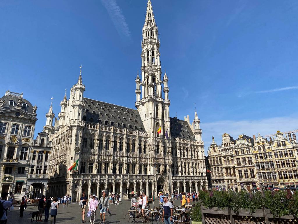 Här ser vi Stadshuset – Hôtel de Ville. Det var den första större byggnaden på Grande-Place. Det har byggts om en del sedan 1400-talet men har kvar originaltornet. Det är 96 meter högt och på toppen står en staty av stadens skyddshelgon Mikael. I detta rådhus finns vigselrum och rådskamrar med magnifika tapeter och förgyllda stuckaturer, konstverk och mosaikgolv.