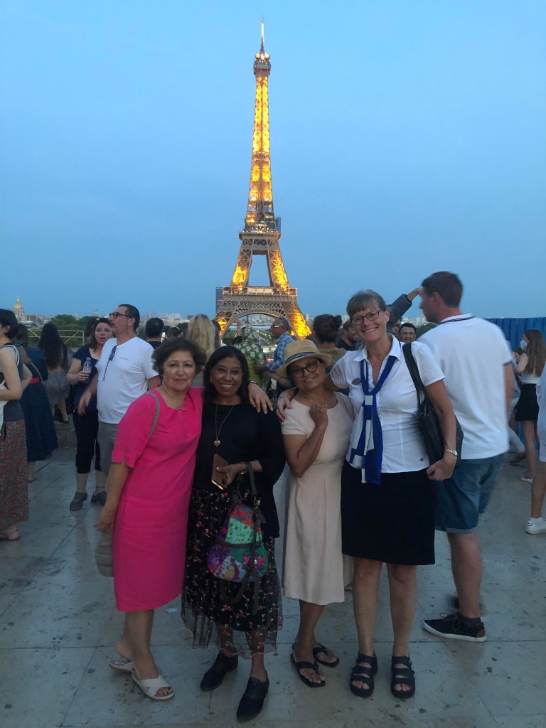 När vi kom till Place du Trocadéro stannade vi och gick ut för att se Eiffeltornet glittra. Varje hel timma efter mörkrets inbrott och fram till midnatt glittrar Eiffeltornet sex minuter. Det är stämningsfullt och alla uppskattar det. Här nedan är jag tillsammans med några glada tjejer i vår grupp. Oj, vad de fotograferade, pratade och skrattade! Det var helt underbart.