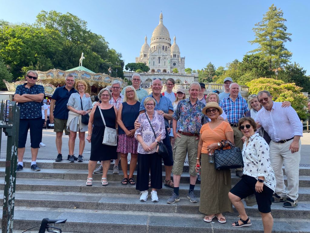 Kl. 18.00 var det dags för kvällsutflykten En glad kväll i Montmartre. Micke släppte av oss vid métrostationen Anvers och vi gick sen uppför den smala gatan mot Sacré-Cœur. En del av gruppen poserar här glatt nedanför kyrkan.