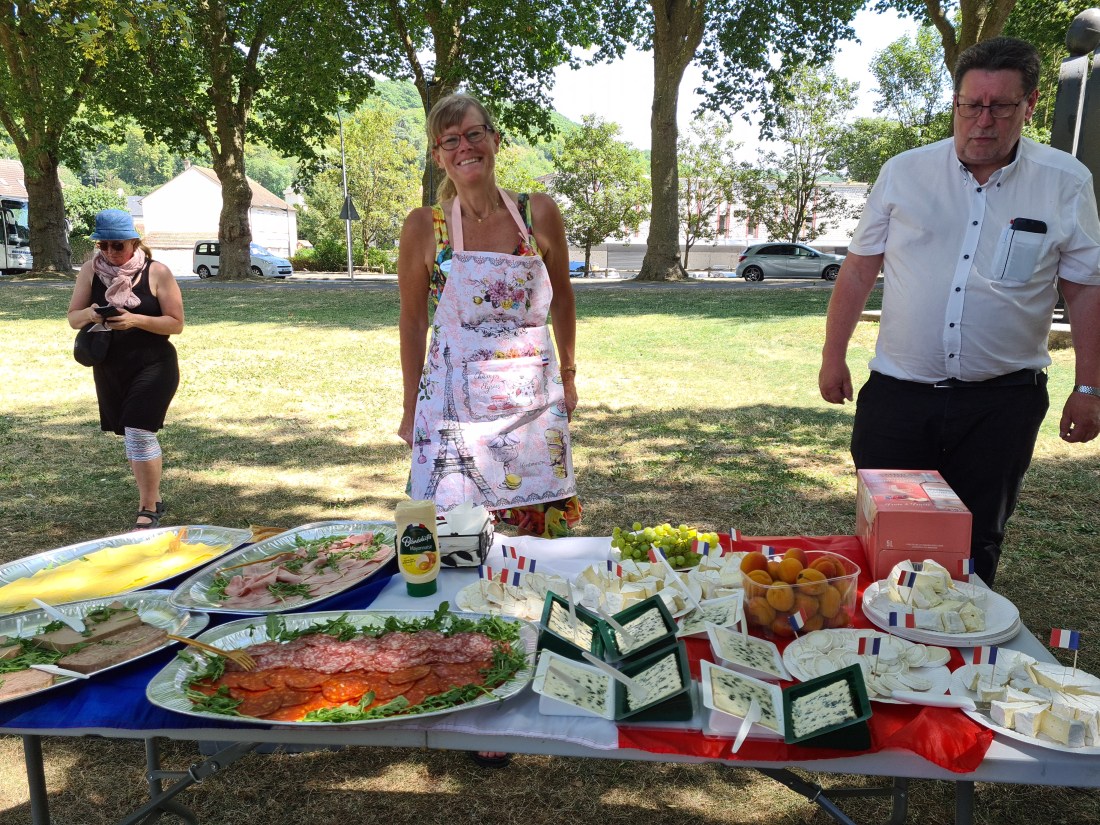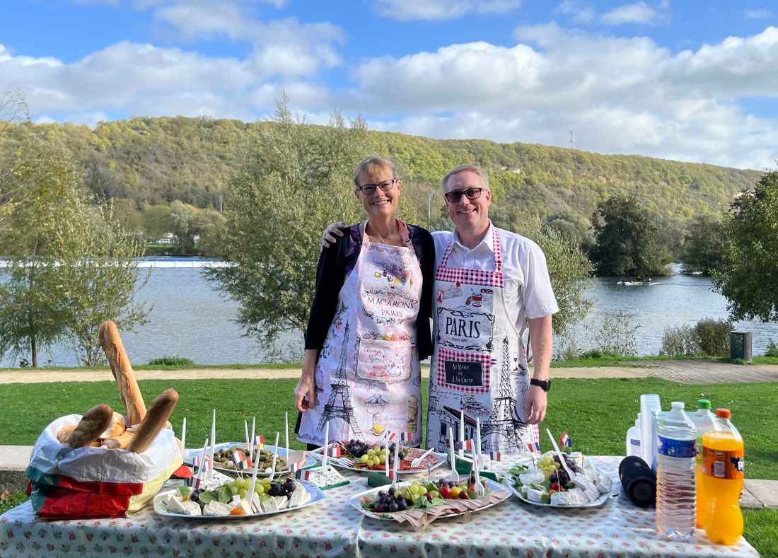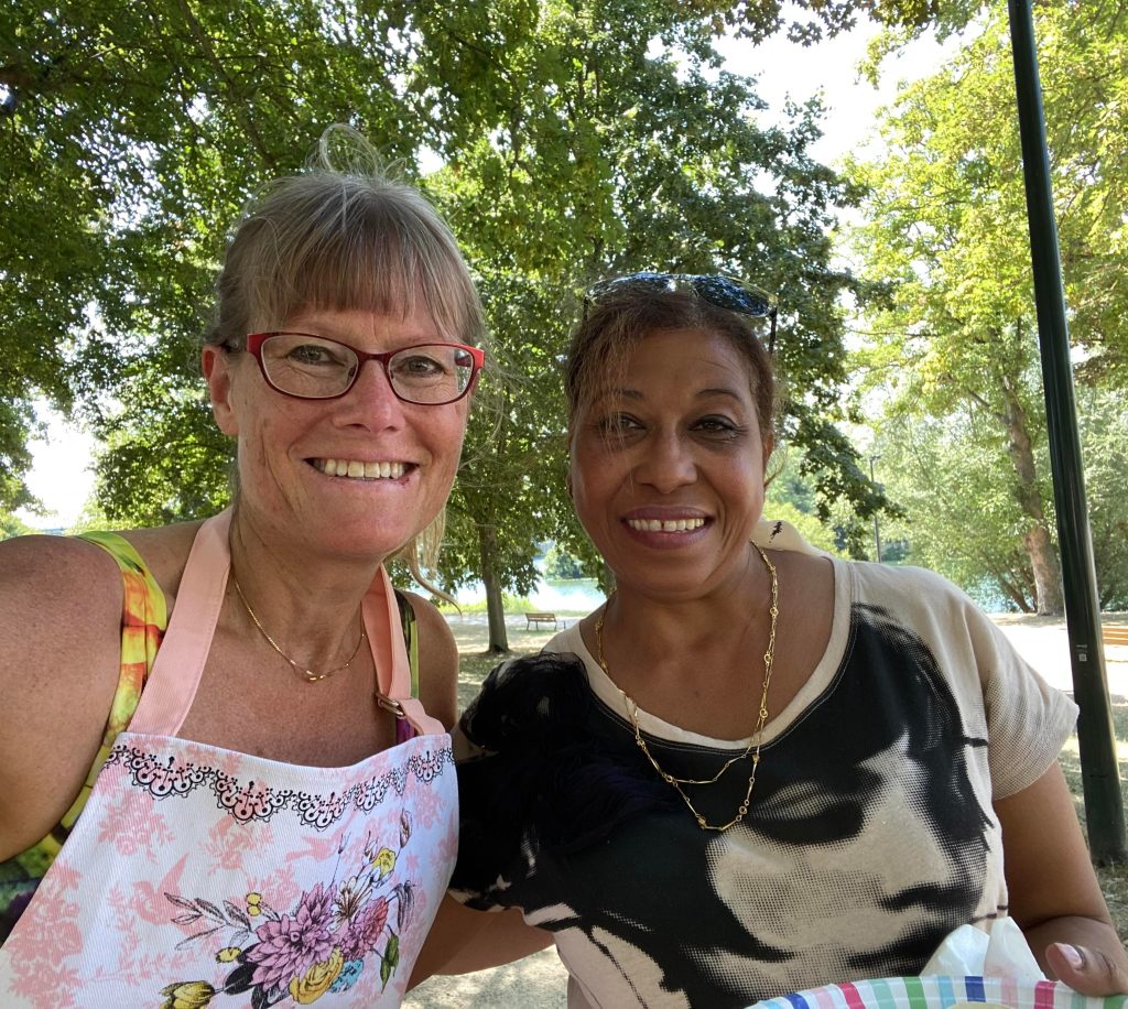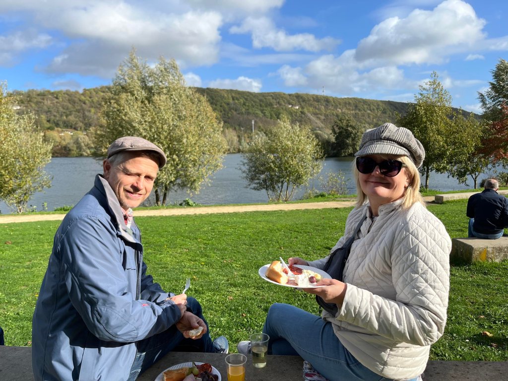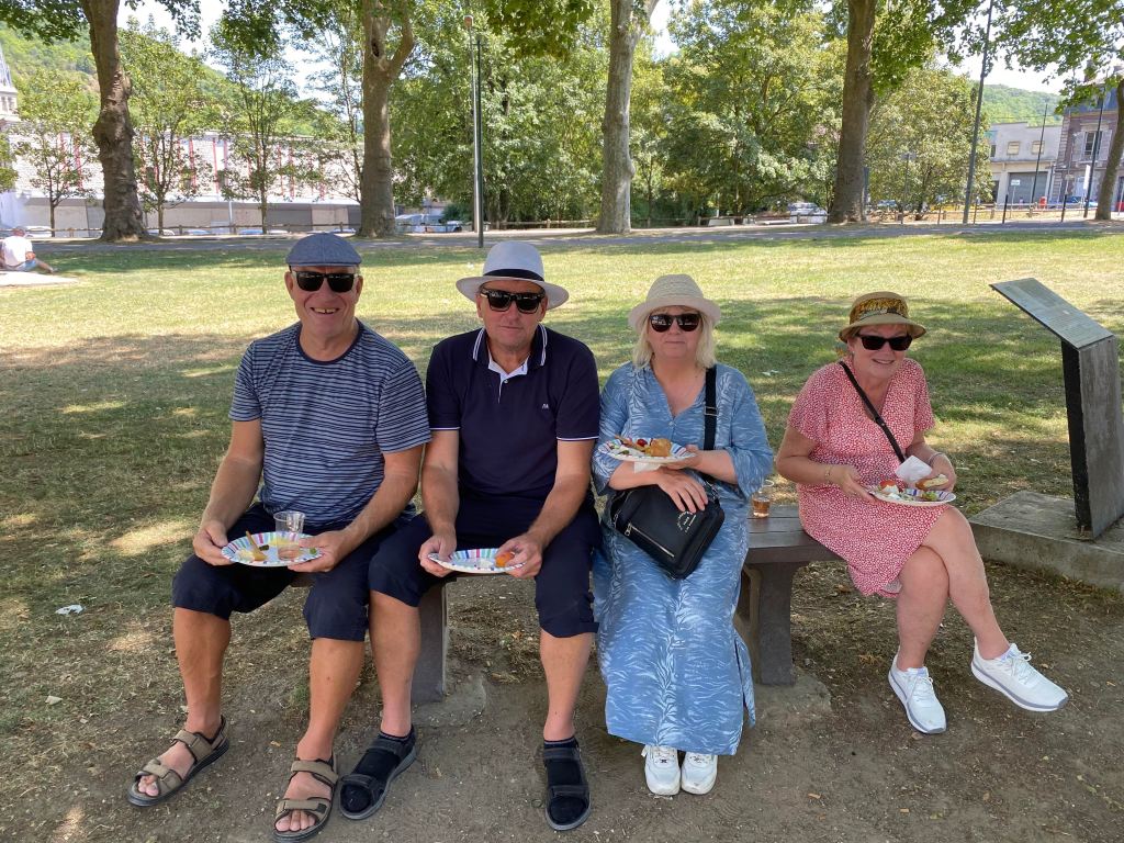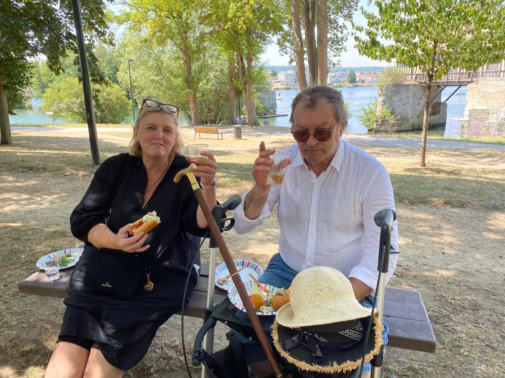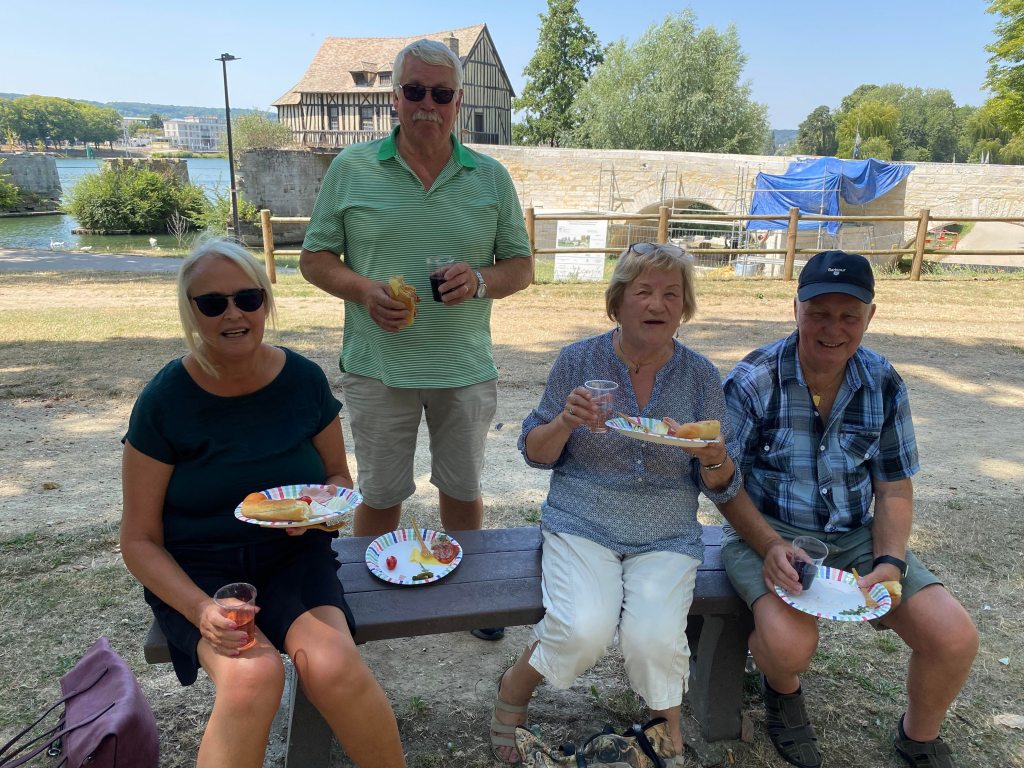 Efter besöket i trädgården hade vi picknick i en park i Vernon. Det serverades baguetter, olika sorters ostar, patéer, skinka, aprikoser, tomater, sallad m.m. Det blev en härlig stund intill floden Seine. Det var nästan 40 grader varmt men det funkade fint i skuggan under träden.