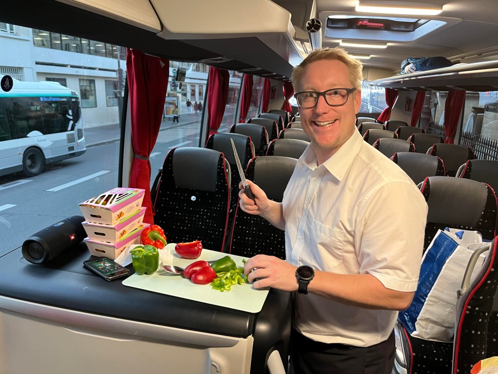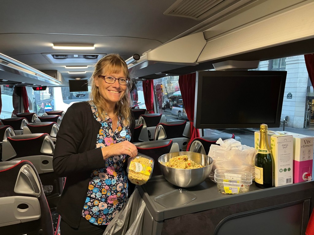 Sen bar det iväg mot Frankrike. Vi passerade gränsen och då spelade vi Marseljäsen, Frankrikes nationalsång. Jag delade ut sångblad, kartor och en parlör. Vi hade lite språkträning och sjöng franska sånger. Stämningen var god. Under eftermiddagen hade vi också en rast då vi dukade upp busscaféet igen.