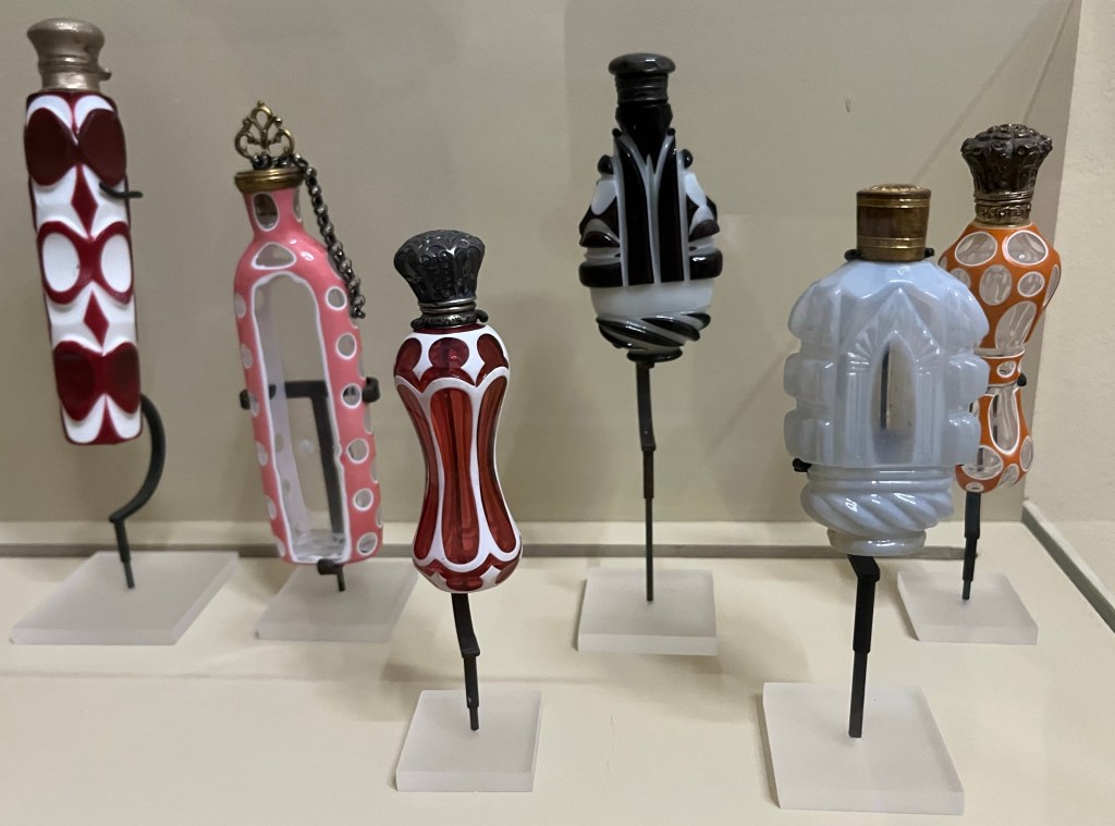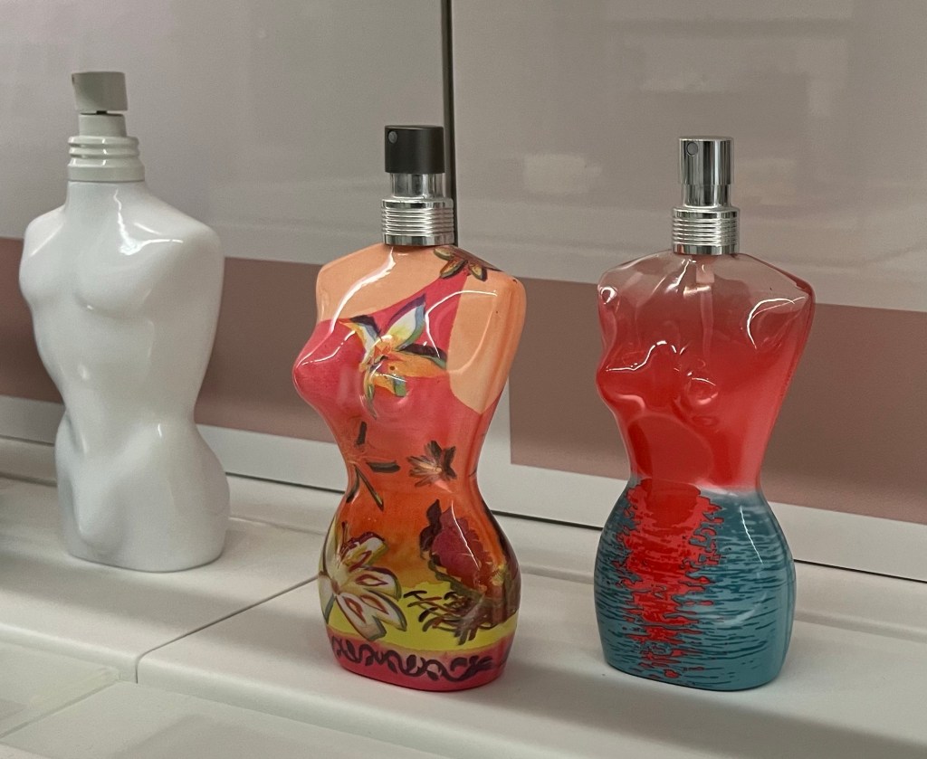 Här ser vi läppstift i form av tändstickor och parfymflaskor i form av kroppar.