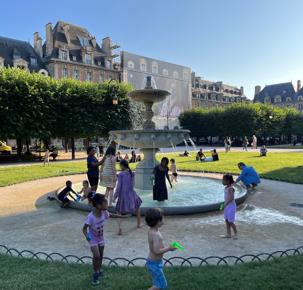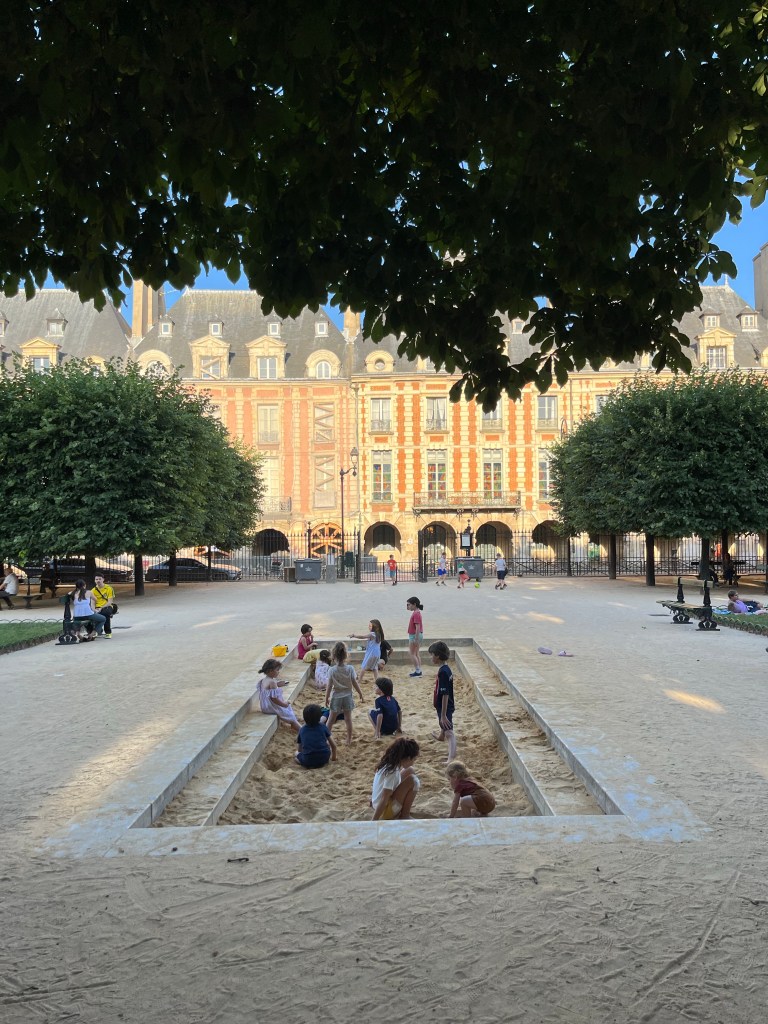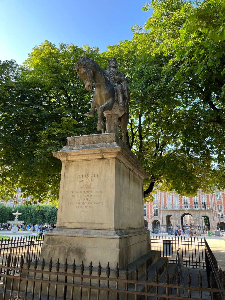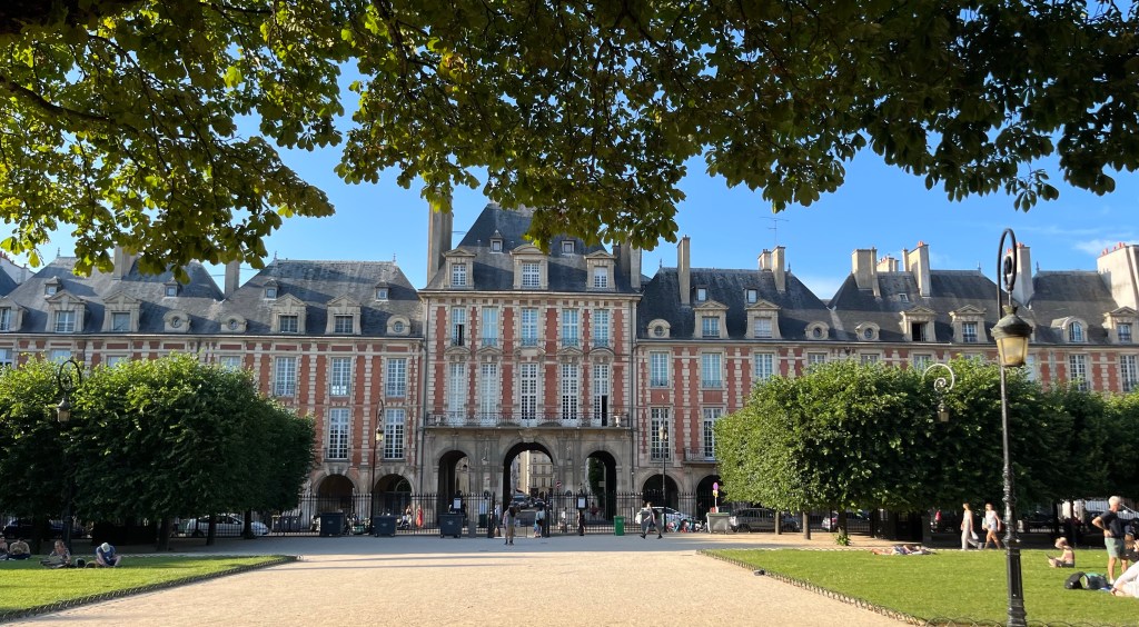 Jag anlände till Gare de Lyon i Paris och tog métron till mitt hotell. Jag packade upp och slappade lite. Sen gick jag ut på en lång promenad för att njuta av den ljumma fredagskvällen. Jag gick först till det vackra torget Place des Vosges. Torget brukar kallas det mest romantiska torget i Paris. Det är helt symmetriskt och kantas av vackert dekorerade tegelhus i klassisk fransk stil, totalt 36 st. När torget invigdes hette det Place Royale men Napoleon döpte om det till Place des Vosges som tacksamhet till departementet Vosges i nordöstra Frankrike som var det första län att betala skatt. Här har bl a Victor Hugo bott. Hans hem är numera ett museum. Här finns restauranger, hotell och caféer.