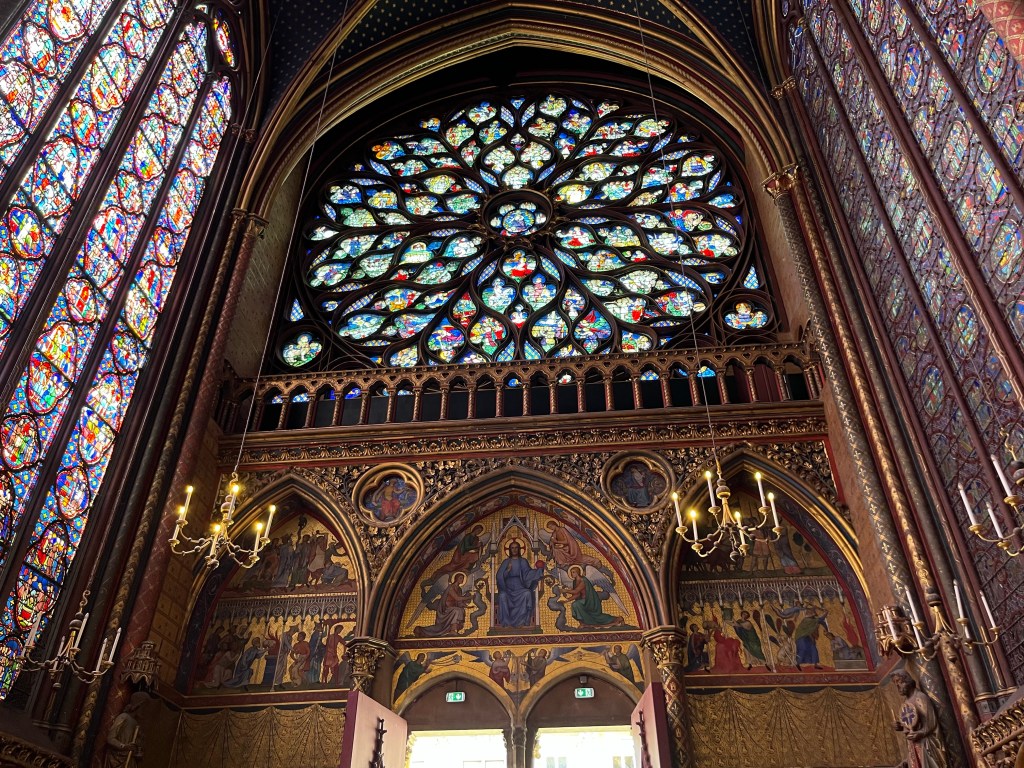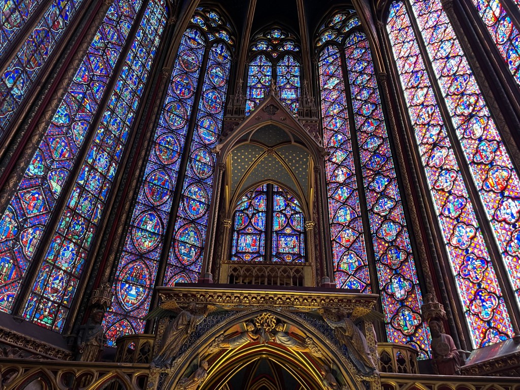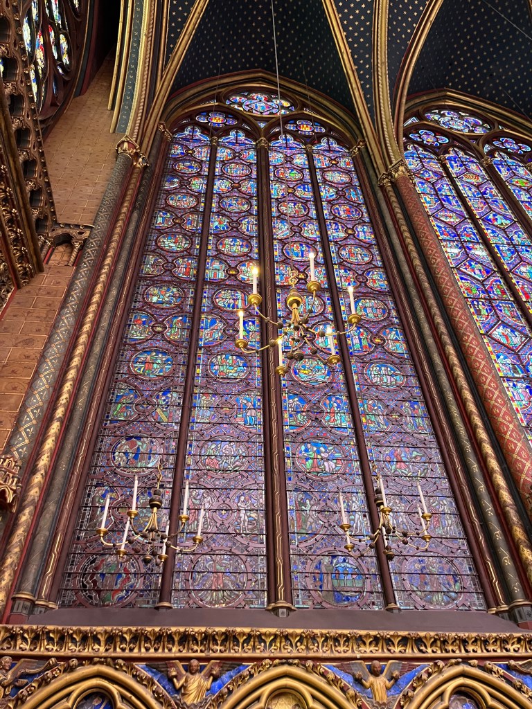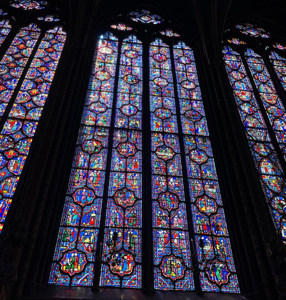 Kapellet har 15 stående målade fönster, de äldsta som finns kvar i Paris. I fönstren ser vi fler än 1000 bibliska händelser från 1 Moseboken till korsfästelsen som i ett kalejdoskop av rött, gult, grönt, blått och violett.