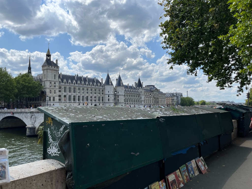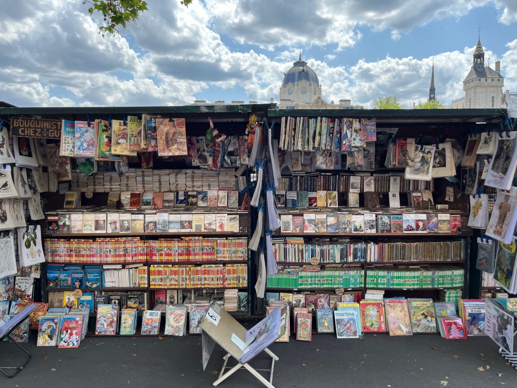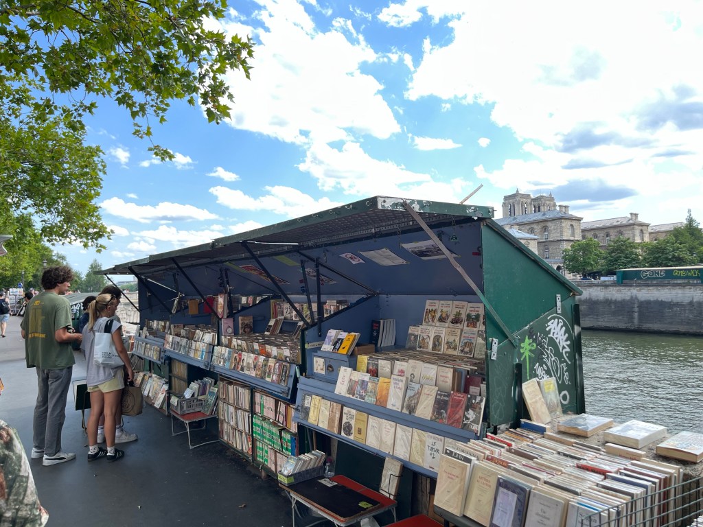 Jag promenerade längs med Seine där Les bouquinistes håller till. De har sina gröna lådor som de öppnar upp och säljer böcker, posters, vykort m m. Mycket är begagnat. Det sägs att det finns 272 stycken lådor men jag är inte säker.