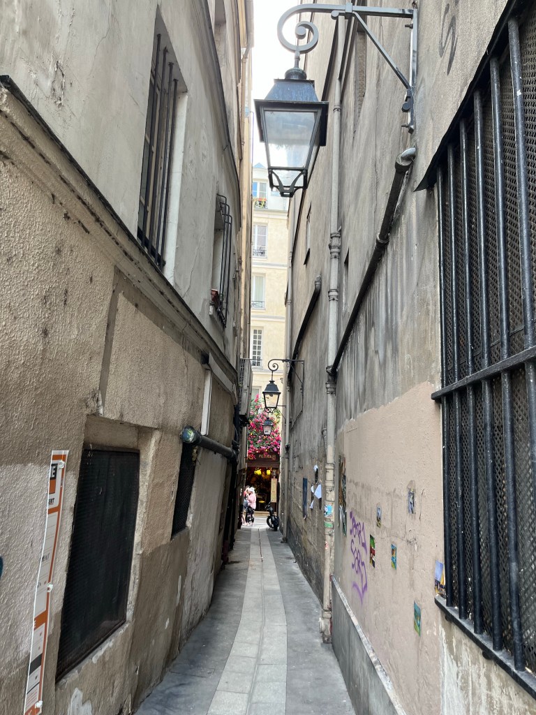 Här går jag på la Rue du Chat-qui-Pêche (den fiskande kattens gata). Det är Paris smalaste gata. Den är inte så lång heller, bara 29 meter.