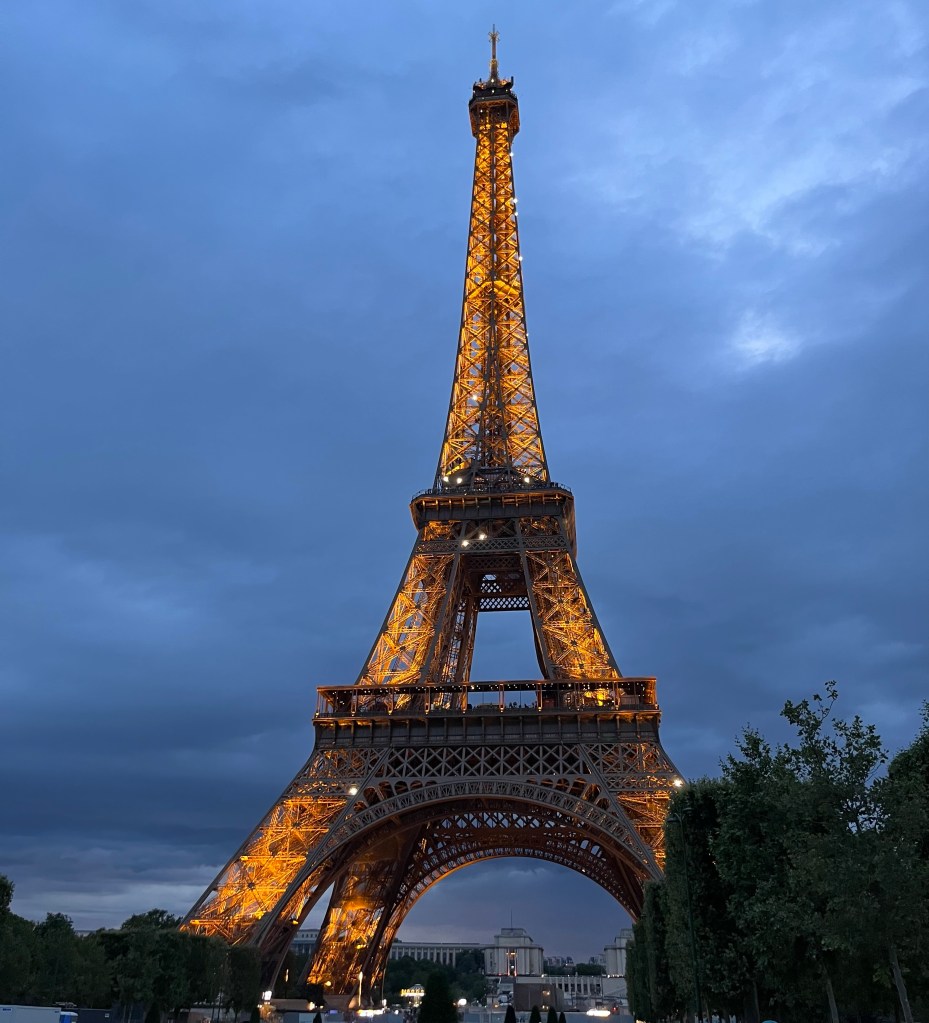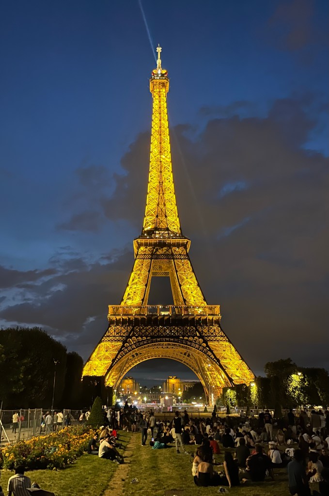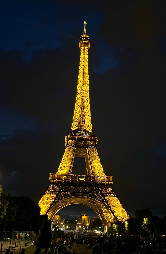 Där satt jag länge och åt och kurade skymning. Jag ville vänta på mörkrets inbrott för då tänds Eiffeltornet och vid varje hel timma blinkar det en liten stund. Det är så maffigt.