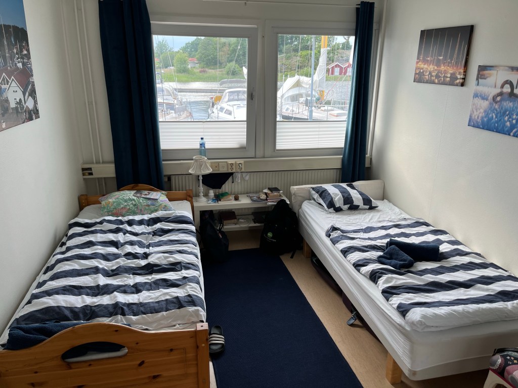 Vi checkade in på Henåns vandrarhem som visade sig vara riktigt fräscht och trevligt. Lakan och handdukar ingår och det var bäddat så vackert med blåvit-randiga lakan. Det får mig att tänka på havet.