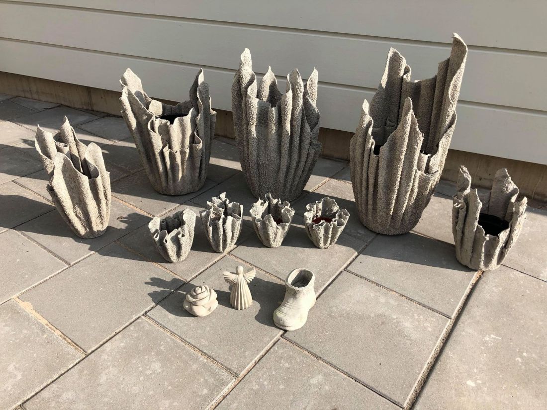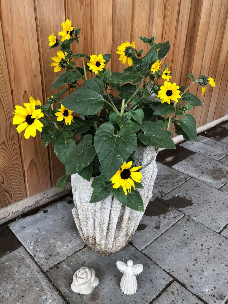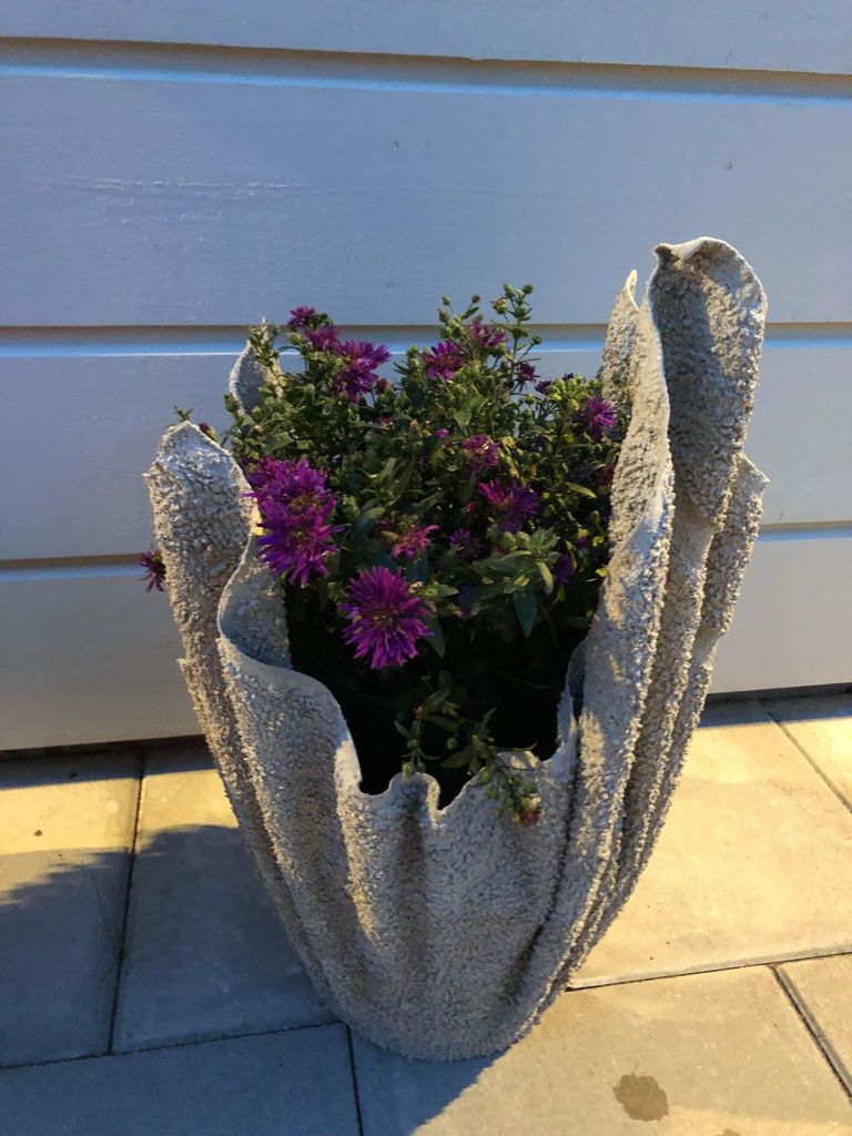 I somras var jag hos min goda vän Gunilla och gjorde krukor i betong. Några är på plats här på Tallkullen. När jag fraktade dem i bilen hem till Jönköping var jag rädd att de skulle gå sönder men jag har insett att de är mycket tåliga. Krukan med solrosen har blåst omkull en massa gånger men den håller. Frottéhandduken inuti betongen gör att det blir mer hållbart och inte alls så skört som jag trodde. Bra!