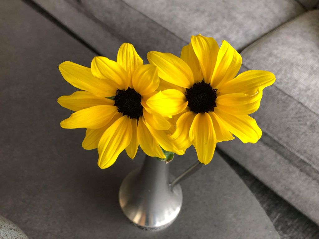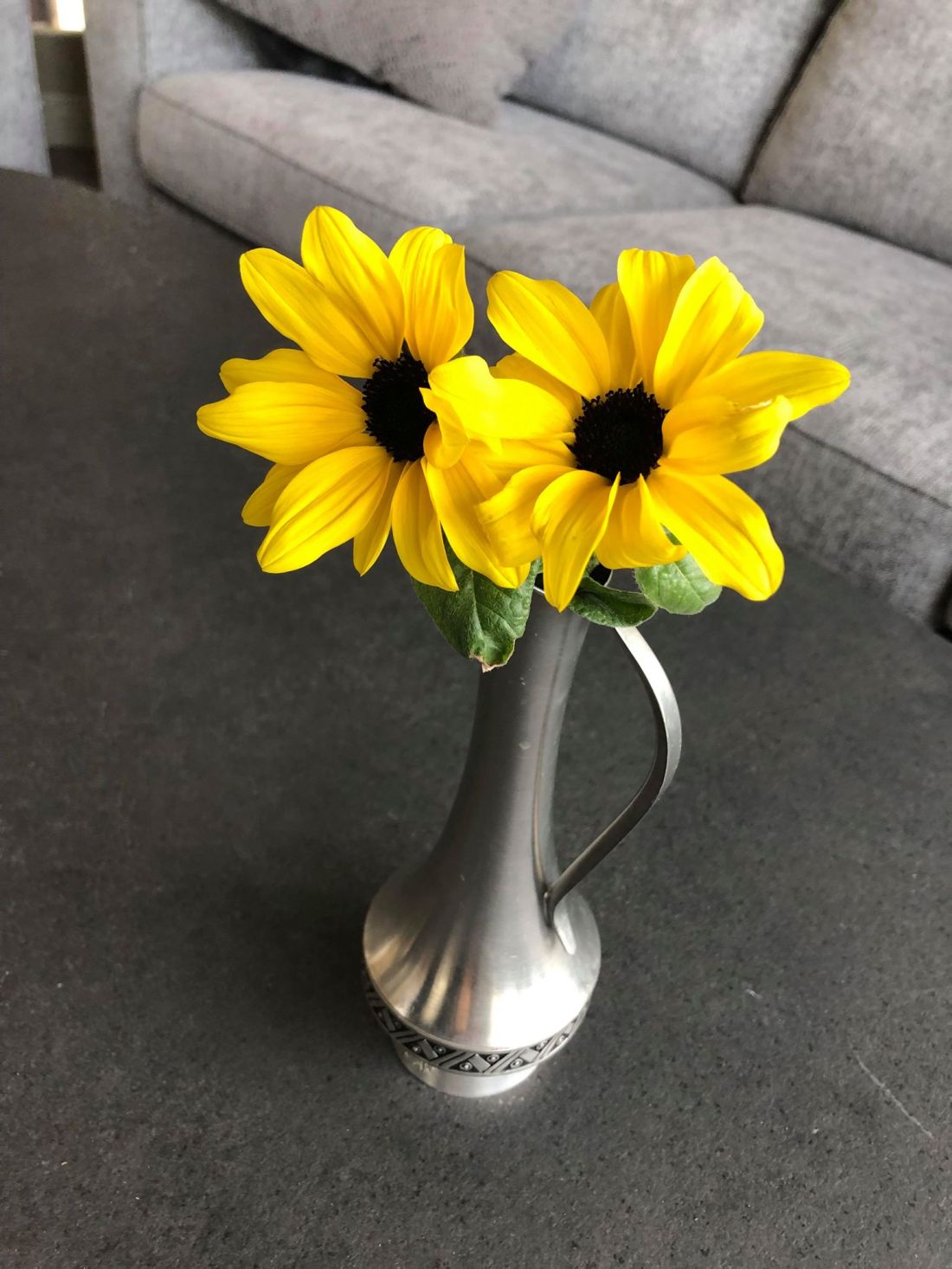 I somras köpte jag solrosen Sunfinity som fortfarande blommar ute. Jag har börjat plocka in några blommor då och då. Det blir så vackert i tennvasen. Jag gläder mig över dessa vackra små ting.