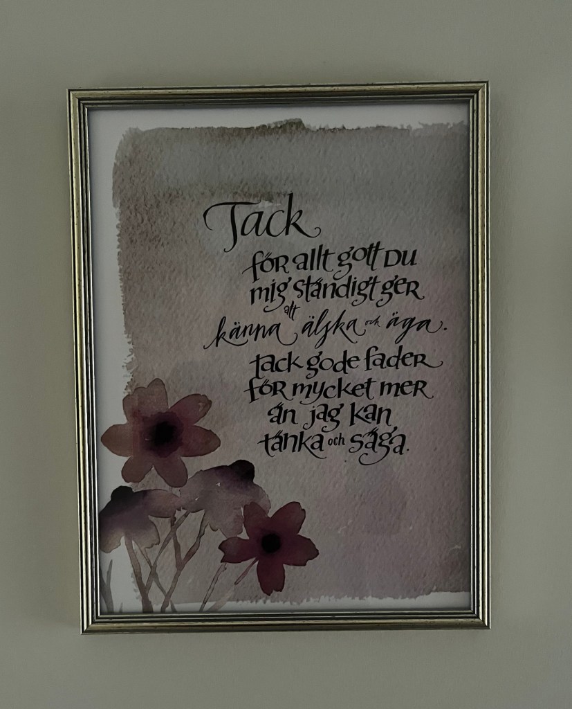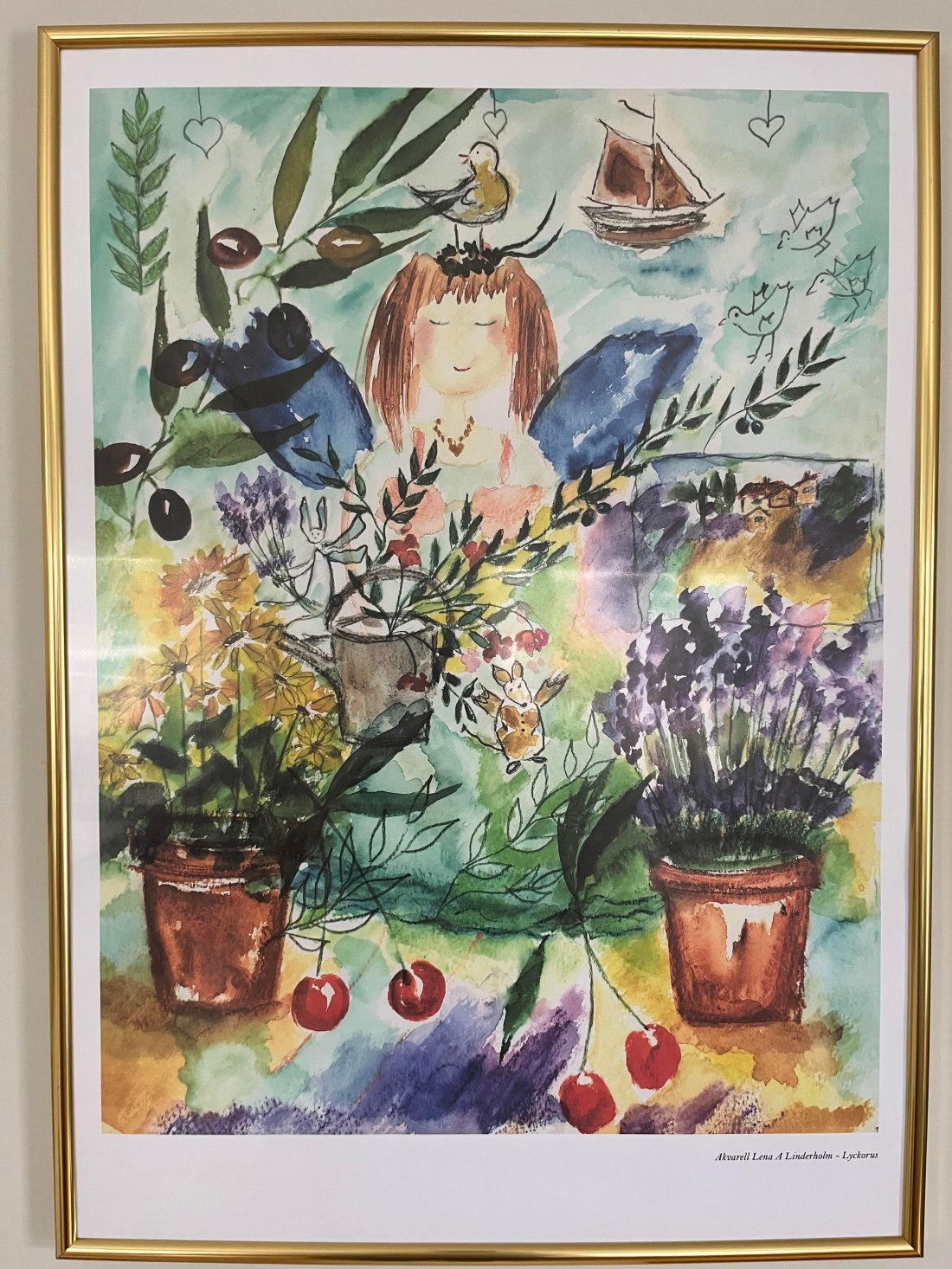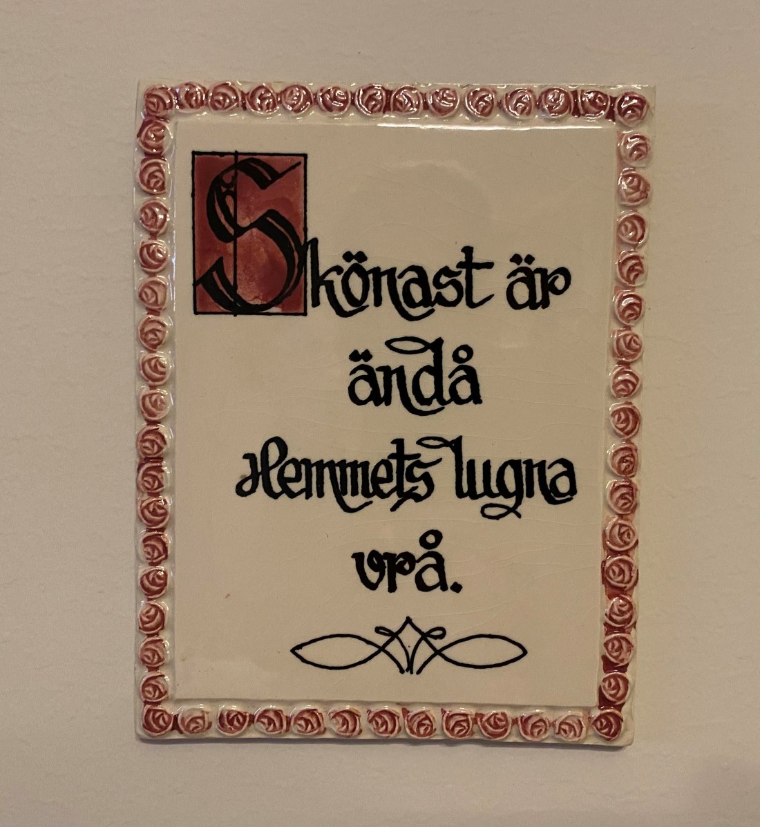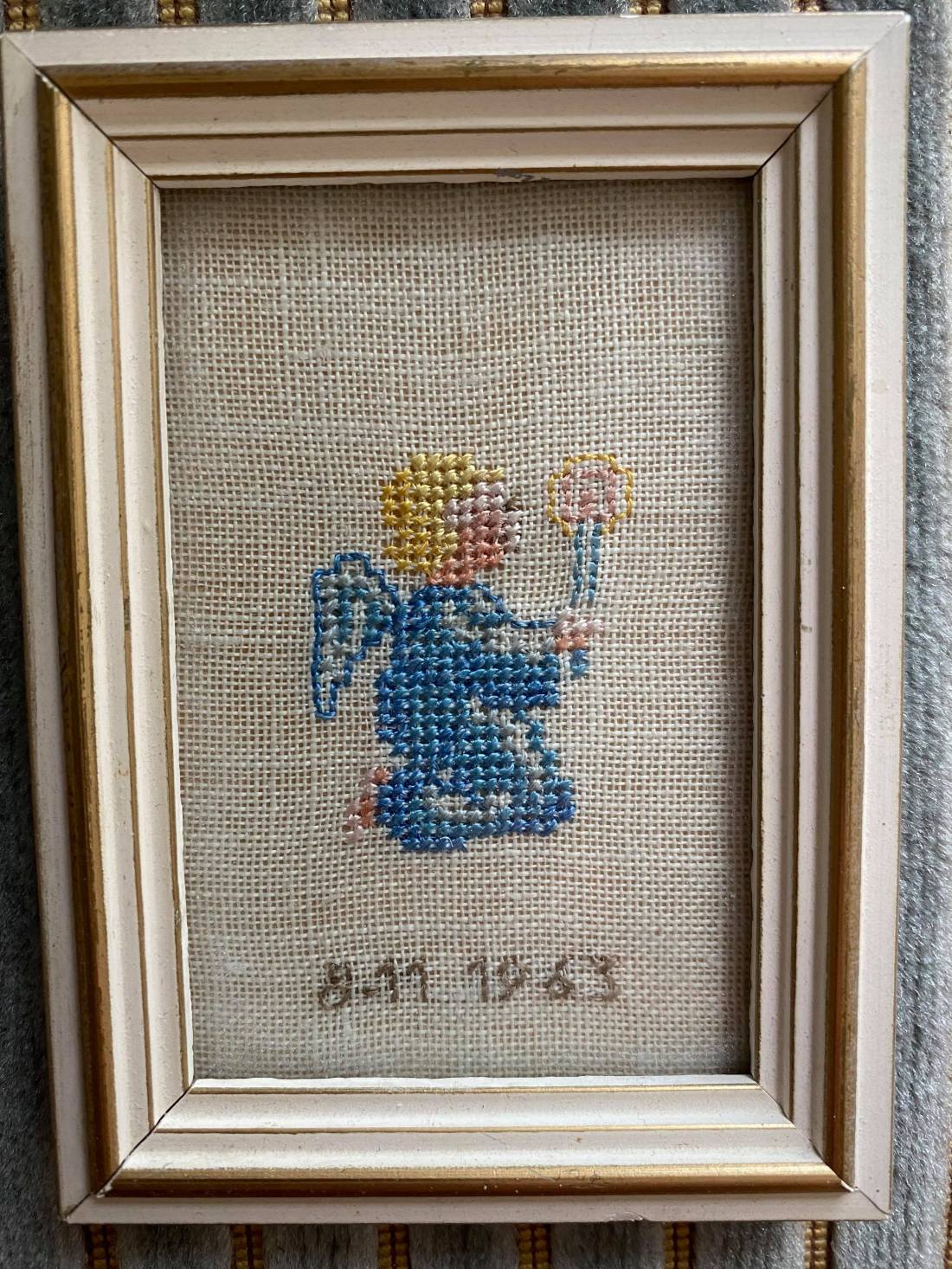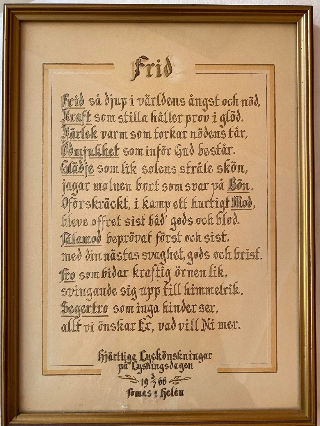 När jag var besökte min moster och morbror för två veckor sen uppmärksammade Barbro mig på en tavla som hängde i deras sovrum. De hade fått den av min bror Tomas och mig på sin lysningsdag. Jag har aldrig lagt märke till den under alla år. Jag blev riktigt glad av att se den. Min kusin Kyllike och jag var brudnäbbar på deras bröllop. Jag var bara två år och åtta månader då.