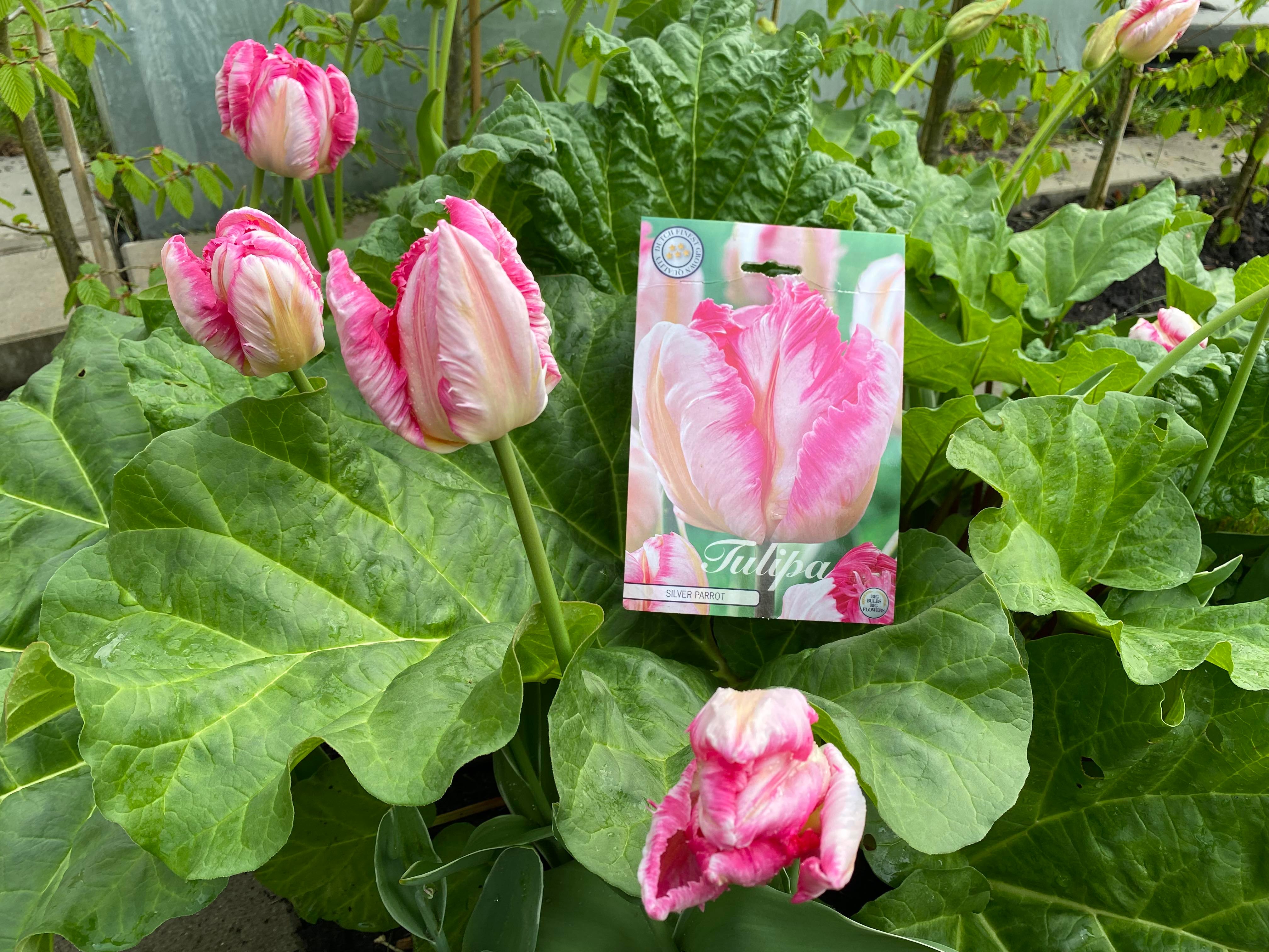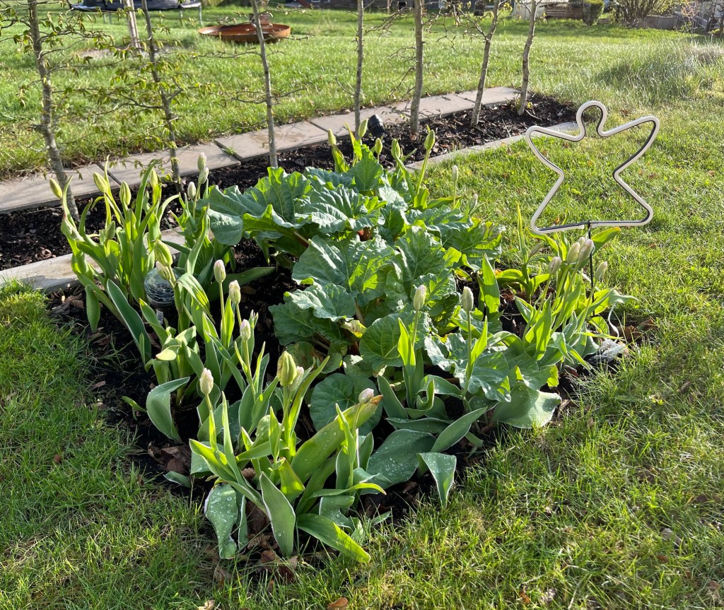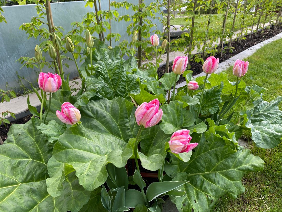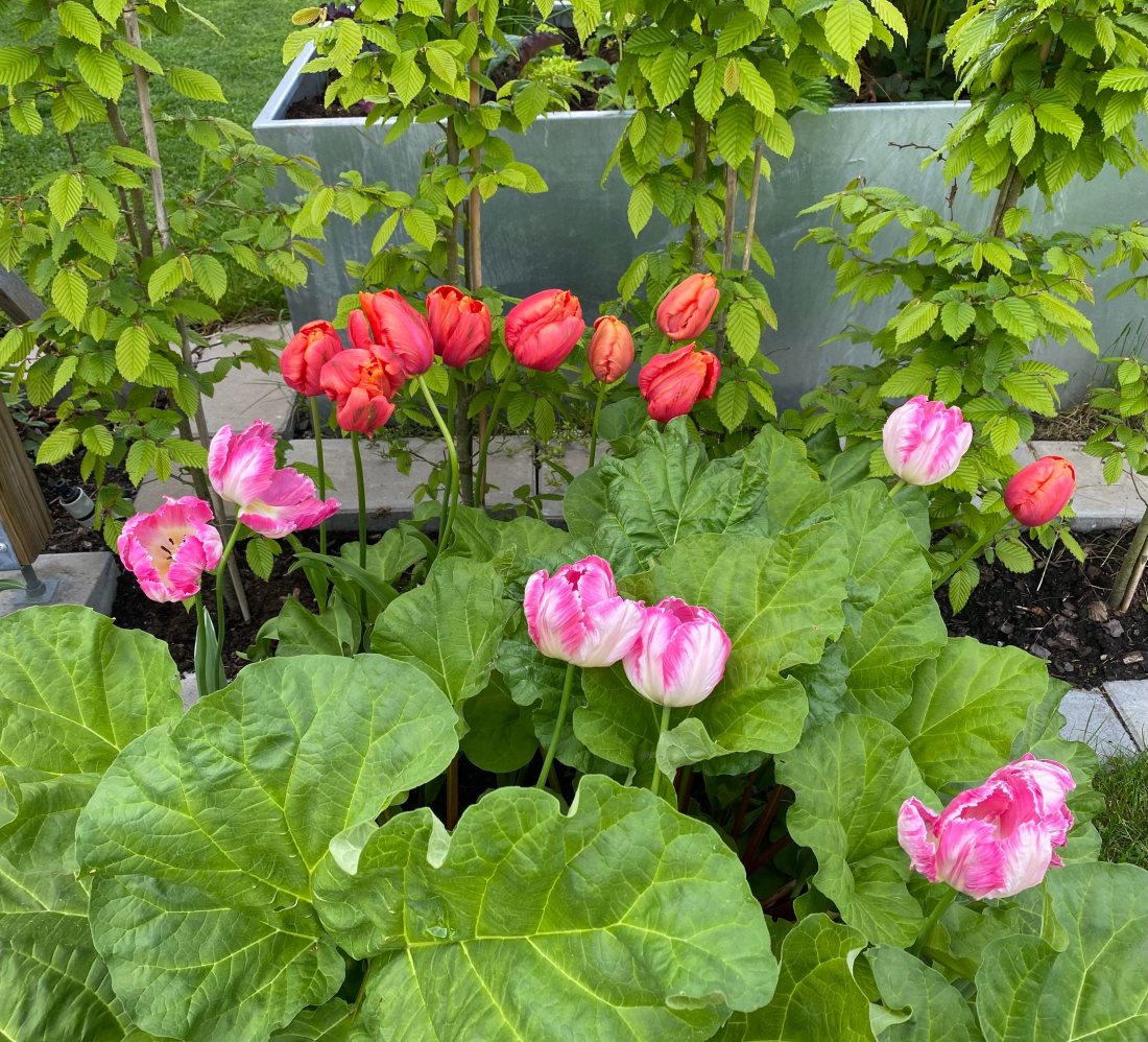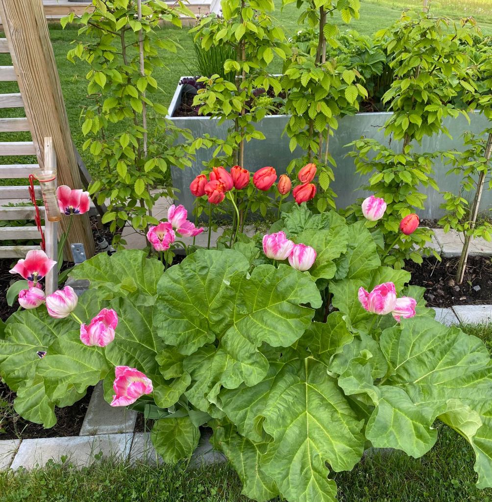 Jag älskar mitt rabarberland extra mycket just nu då de kantas av de blommande tulpanerna Silver Parrot.