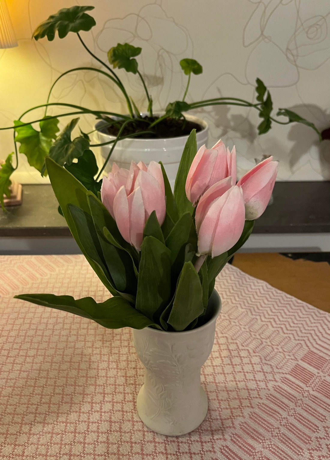 Visst är mina rosa tulpaner fina? Ser man att de inte är äkta? För ca 10 år sen fick jag dessa av en vän. De var tänkta att ligga på en hylla, skänk el liknande och så fick de göra under många år tills jag inte tyckte de var fina längre. Då hamnade de i en låda. Idag när jag gick igenom lite grejer i lådan kom jag på att tulpanerna ändå är ganska fina och borde funka att ha i en vas. Sagt och gjort! Nu står de här så fina på mitt kontor och kommer att förgylla mina dagar. Det är nästan så jag tycker att de ser äkta ut.