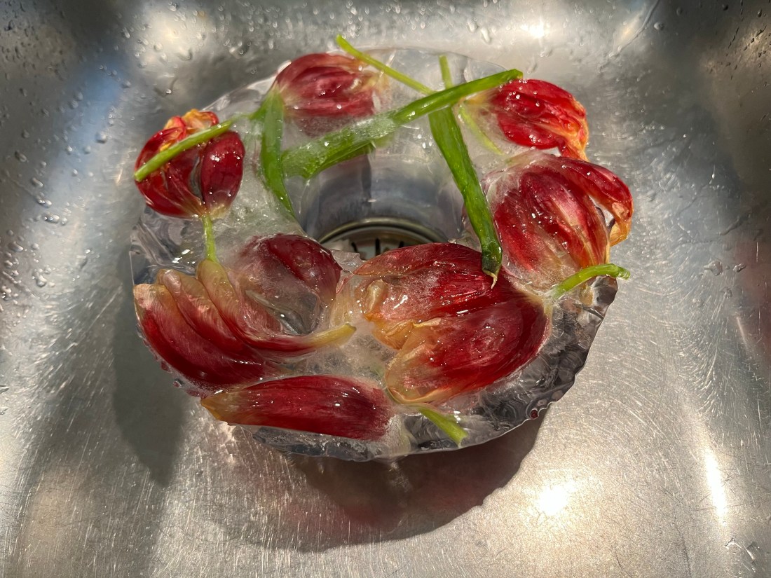 Kolla vad jag har i frysen! Jag frös in islyktor i vintras när jag hade blommor som höll på att vissna. Denna blev dock inte framtagen ur frysen. Jag hade tänkt ställa ut den i söndags när en kompis kom hit men tyckte inte att det passade så bra i högsommarvärmen så jag lade in den i formen igen. Jag vill inte ha den i frysen längre så jag tror jag tar fram den till midsommar. Den kan vara fin att pynta bordet med när en kompis är här. Den varar längre här inne än ute i värmen. Blommor gör mig glad.