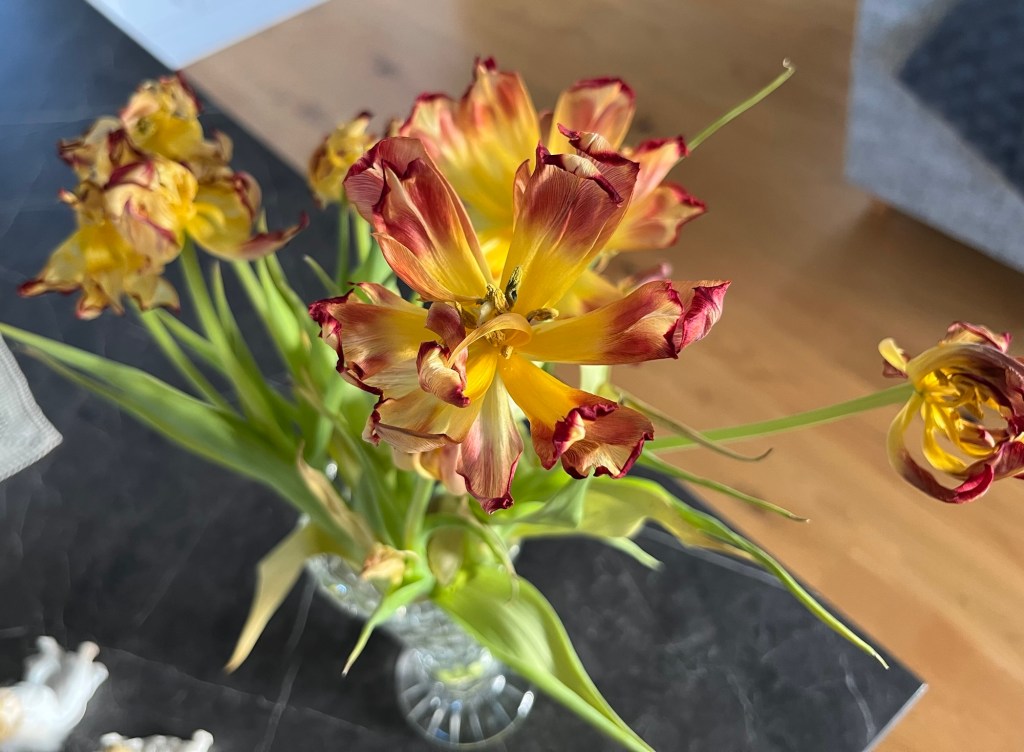 Ibland tycker jag att vissna tulpaner är vackra. De liknar konstverk. Däremot tycker jag att denna bukett varken är vacker eller konstnärlig längre så jag slängde den idag.