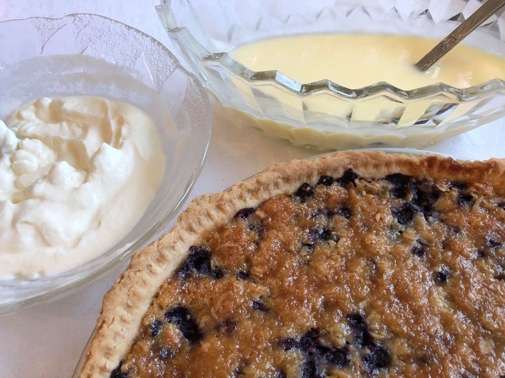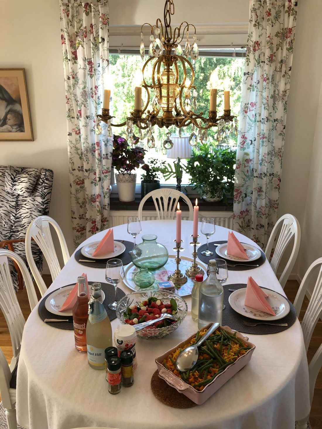 Det är alltid vackert dukade bord hos Susanna vilket är en fröjd att få sätta sig vid. Ikväll bjöd hon på en god laxrätt med färsk pasta, tomater, saffran m m. Det smakade mycket gott. Sen blev det blåbärspaj, grädde och vaniljsås samt kaffe. Mums!