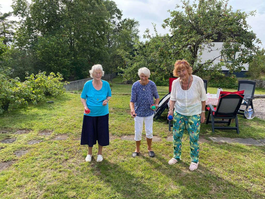 Kaffe och efterrätt tog vi ute i trädgården. Jag hade med en chokladmintkaka från Jönköping och till den blev det fruktsallad och vispad grädde. Här ser vi de glada damerna spela boccia.