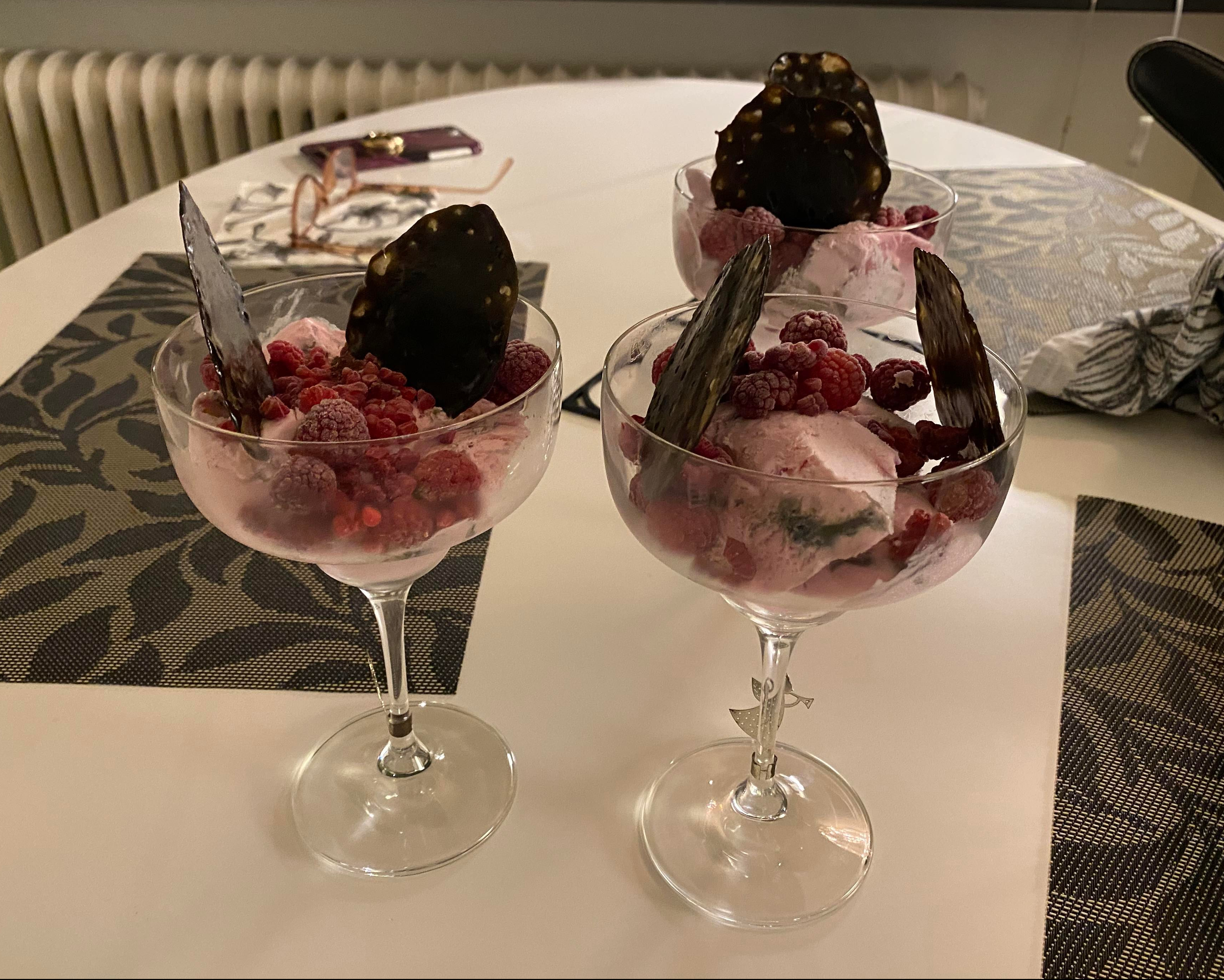 Först fick vi en frisk välkomstdrink. Sen blev det en förrätt bestående av ett smördegsknyte med spenat samt små goda kex. På ett kex var det saffransmjukost vilket jag inte smakat tidigare. Det var gott men jag kunde inte urskilja någon saffranssmak. Jag missade att fotografera huvudrätten som bestod en god thailändsk gryta med kyckling och grönsaker samt ris därtill. Till dessert fick vi hallon- och lakritsglass med extra hallon och lakritsflarn samt kaffe. Mums!