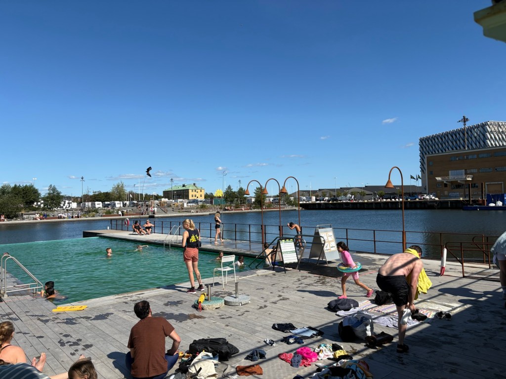 Wow, vilken dag i Frihamnen! ☀️ Trevligt boende på Waterfront Cabins. Man får inte bada i Göta älv men jag svalkade mig i både sötvatten- och saltvattenbassänger vid Jubileumsbadet, strax intill Frihamnskyrkan och precis intill mitt boende.