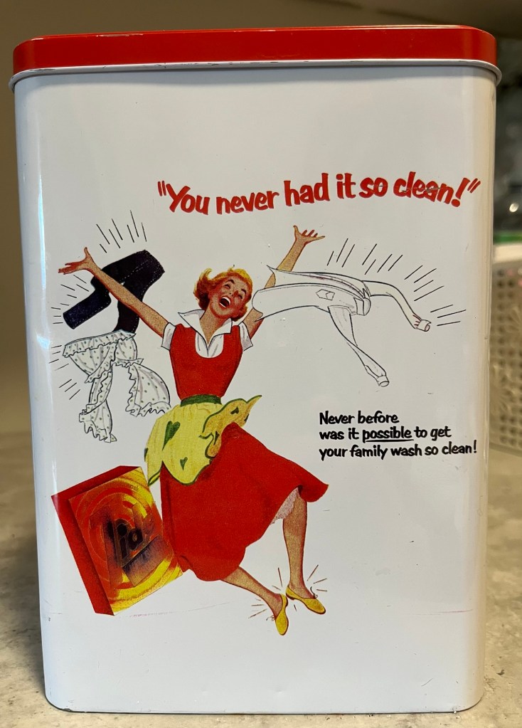 Att ha roliga saker hemma piggar upp livet. Denna plåtburk till tvättmedel har jag haft länge och jag gillar den. Texten lyder: You never had it so clean! Never before was it possible to get your family wash so clean! Fritt översatt: Du har aldrig haft det så rent! Aldrig tidigare har det varit möjligt att få din tvätt så ren!